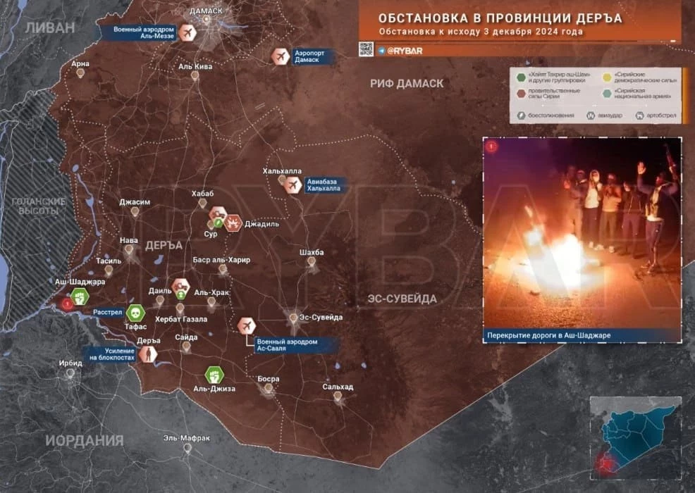 На фоне этого в сельской местности провинции происходят нападения спящих ячеек, а также протесты. В Аль-Джизе местные жители вышли в поддержку наступления боевиков в Хаме и Алеппо, а в Аш-Шаджаре перекрыли горящими покрышками одну из трасс, сообщает Telegram-канал "Рыбарь".