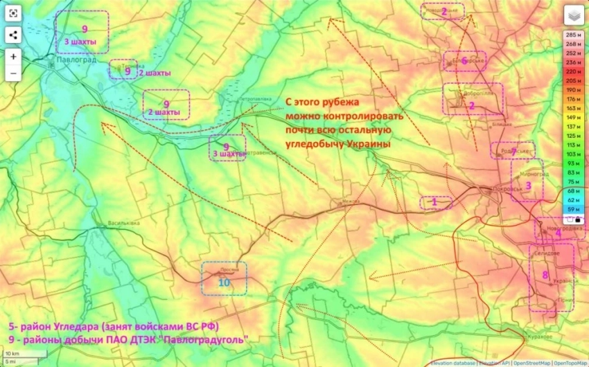 Причём, чтобы лишить Киев этого угля сам Павлоград брать совсем не обязательно. Достаточно дойти до рубежа, обозначенного на карте красным пунктиром и добыча на всех шахтах прекратится.