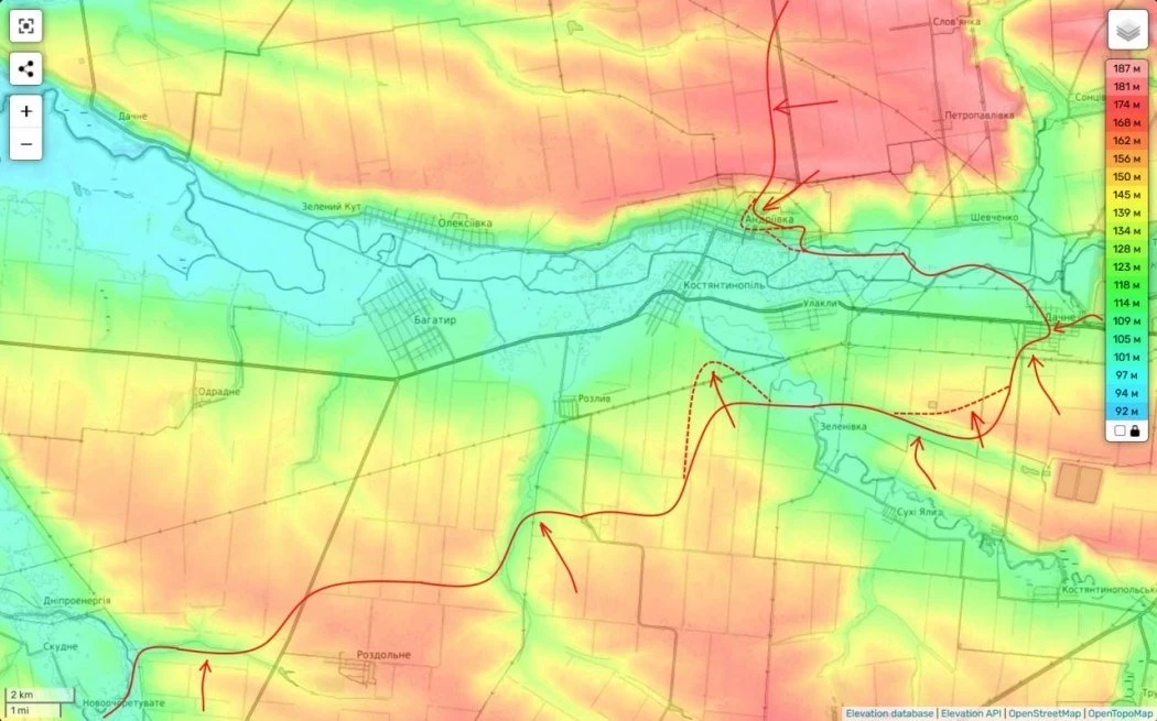 Противник удерживает только малую часть в восточной части Дачного, и вероятно скоро будет выбит и оттуда. Но это не прекратит мучения данной группировки, потому что северо-западнее наши части постепенно забирают у противника Андреевку, а с юга вышли ранее к Константинополю.