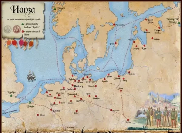 Карта с изображением основных путей Ганзейского союза. Ганзейский союз был позднесредневековой сетью экономически независимых купцов на дальние расстояния, которая была основана на доверии, репутации и взаимных отношениях. Сотрудничество между ее членами поддерживало транзакционные, информационные и организационные издержки на низком уровне, позволяя ганзейским купцам получать хорошую прибыль от торговли на дальние расстояния между Балтийским и Северным морями. Благодаря личным и институциональным связям с конфедерациями городов ганзейские купцы изначально смогли укрепить свое международное положение власти.