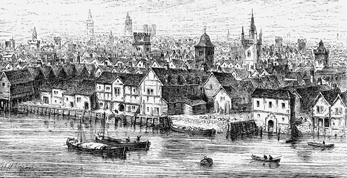 Справа: лондонская гавань. Слева: город Любек — «Королева Ганзы».