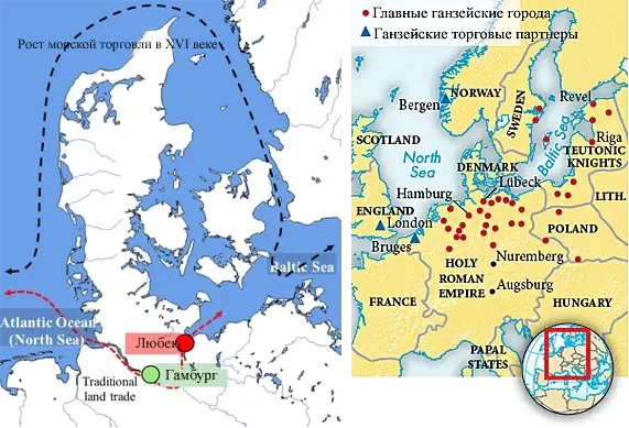 До прибытия голландцев почти вся торговля с Балтикой проходила через Любек. Точно так же Гамбург извлекал выгоду из того, что был единственным крупным атлантическим портом Ганзейского союза. Связь между Любеком и Гамбургом была важнейшим маршрутом для торговли на севере.