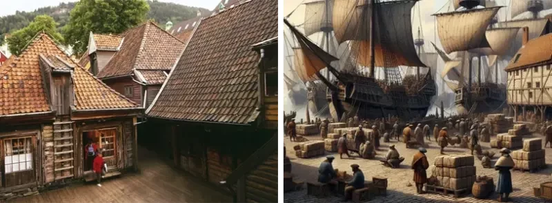 На фото слева: за красочными фасадами исторического памятника Бергене сохранилось множество купеческих домов. Источник: издательство De Agostini. На фото справа: типичный средневековый морской порт.