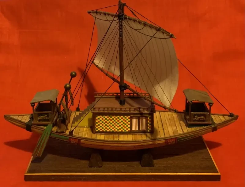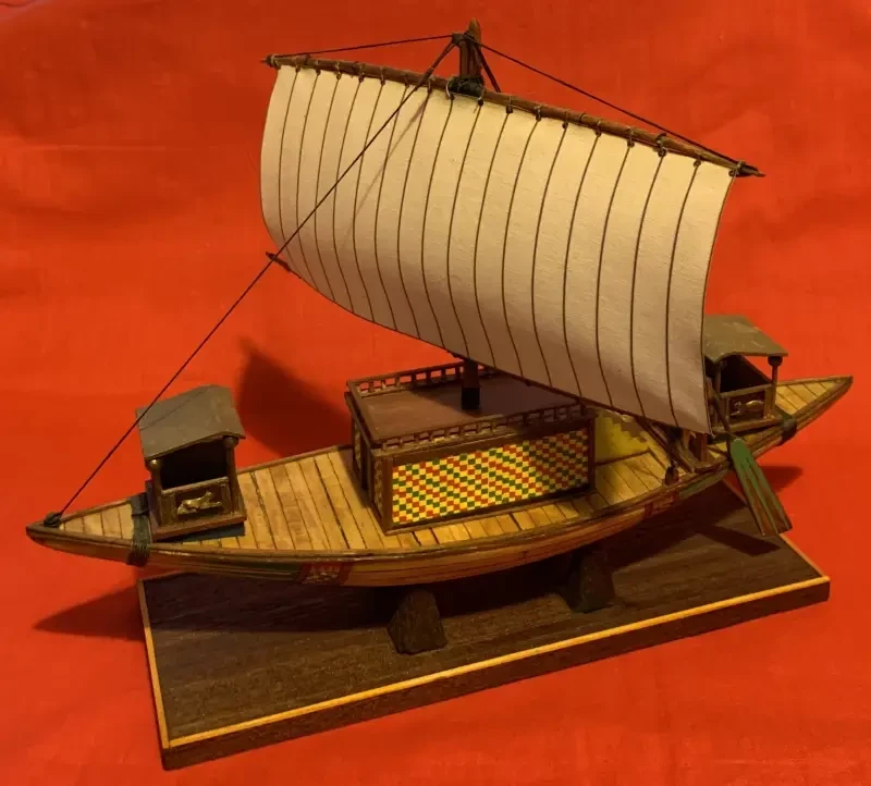 Пришлось полученные фигурки переделывать: отрывать им и переклеивать руки, менять позы, а в ногах высверливать отверстия и вставлять в них металлические штыри для прочного крепления на палубе. Затем последовал не менее сложный процесс их раскраски, однако в итоге всё получилось так, как было задумано. Экипаж ладьи уменьшился, но ее внешний вид от этого не пострадал. На нос были поставлены два гребца с длинными шестами, за ними позади надутого ветром паруса – опахолоносец с опахалом, под тентом в кресле расположилась дама на прогулке, а позади нее на помосте рулевой, управляющий двумя веслами.