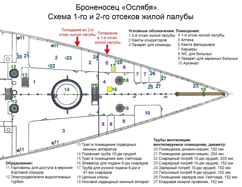 Для наглядного восприятия информации о повреждениях «Осляби», распространении воды и действиях экипажа автор подготовил несколько схем.