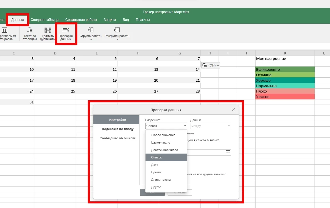 - Теперь при нажатии на ячейку появится выпадающий список с вариантами настроения.
