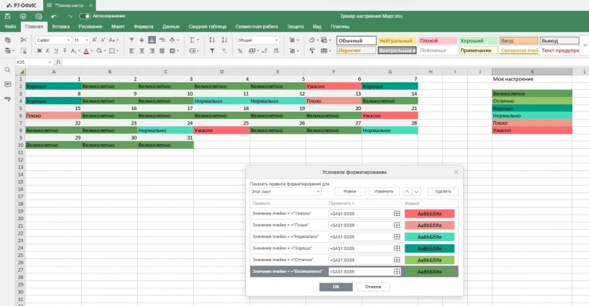 В отдельной колонке создайте шкалу настроений. Например, используйте шесть уровней от «Великолепно» до «Ужасно», каждому присвойте свой цвет.