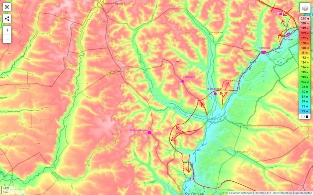 Основные направления движения здесь - на Каменку (сразу со стороны н.п. Дополи и Фиголевка).также наши подразделения вышли на окраины Кондрашовки (это попытка перерезать трассу Купянск - Большой Бурлук и охват Купянска с северо-запада.