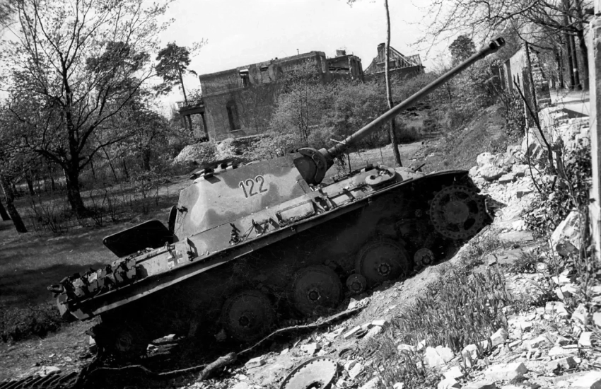 Танк «Пантера» из 1-й роты 1-го батальона 29-го танкового полка дивизии «Мюнхеберг», уничтоженный в ходе боёв за Берлин. Этот танк один из 10 «Пантер», подготовленных к применению ИК-оборудования ночного видения и поступивших в дивизию в начале апреля 1945 года. (Д. Лиходед «Март 1945 года: Бои у Кюстрина»)