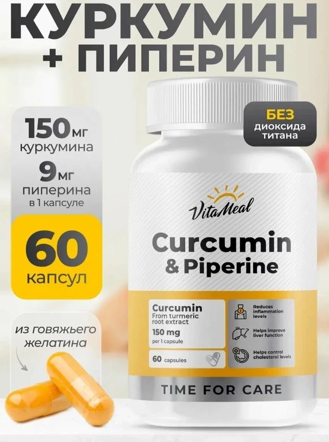 Curcumin & Piperine от VitaMeal — мощный БАД для суставов и хрящей (рейтинг на маркетплейсах стабильно высокий) на основе природных экстрактов куркумы и черного перца. Этот дуэт работает синергично: куркумин снижает воспаление, нейтрализует свободные радикалы, поддерживает печень и сердце, а пиперин усиливает его усвоение. Отличный выбор для профилактики артритов, кожных проблем, метаболических сбоев и даже высокого холестерина — и всё это без лишней химии.