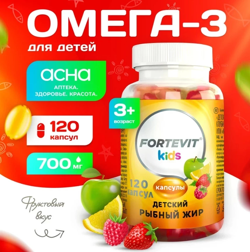 Омега 3 для детей жевательные капсулы с 3 лет детский рыбий жир фруктово-ягодный микс, Рыбный жир Омега-3 для детей Fortevit Kids капсулы для иммунитета, сердца и сосудов. 120 жевательных капсул omega 3 для детей аптека асна