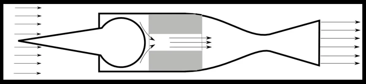 ПВРД технически прост. Ему не нужен компрессор, ему не нужна турбина. Он использует для сжигания топлива атмосферный воздух, который сжимается путем элементарного перепускания на большой скорости. В этом плане ПВРД интереснее, чем ракетный двигатель, который должен нести с собой запас окислителя.