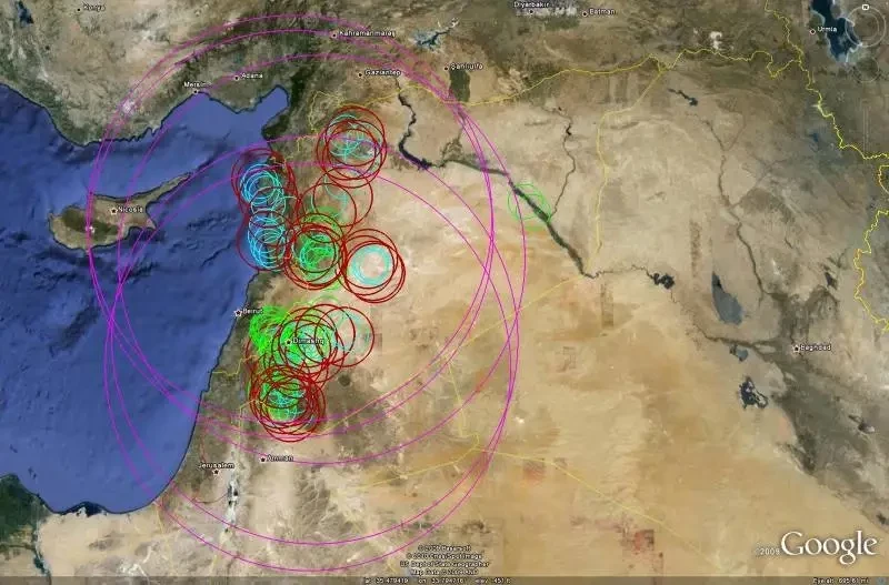 Зоны поражения сирийских систем ПВО по состоянию на 2010 год. ЗРК С-200ВЭ обозначены фиолетовым цветом, С-75 – красным цветом, С-125 – синим, «Квадрат» – зеленым.