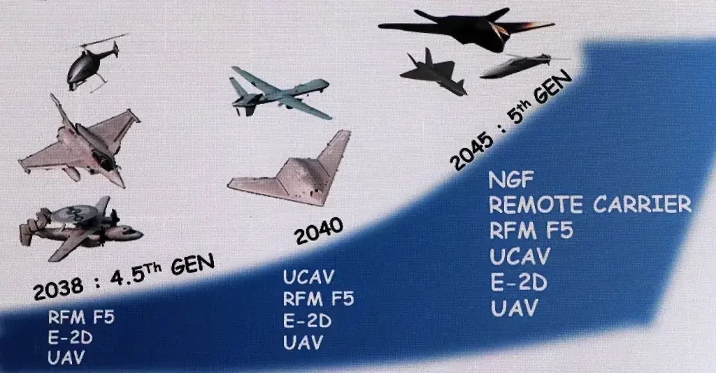 Представитель ВМС Франции представил обширный план развития авианосного крыла страны до 2045 года. Хотя этот план, вероятно, отражает лишь одно из возможных представлений о том, какие самолёты можно будет увидеть на борту авианосца ВМС Франции в будущем, примечательно, что он включает в себя значительное количество беспилотных летательных аппаратов наряду с передовыми пилотируемыми самолётами (насчёт «передовых», если это будут «Рафали», есть много сомнений уже сегодня).