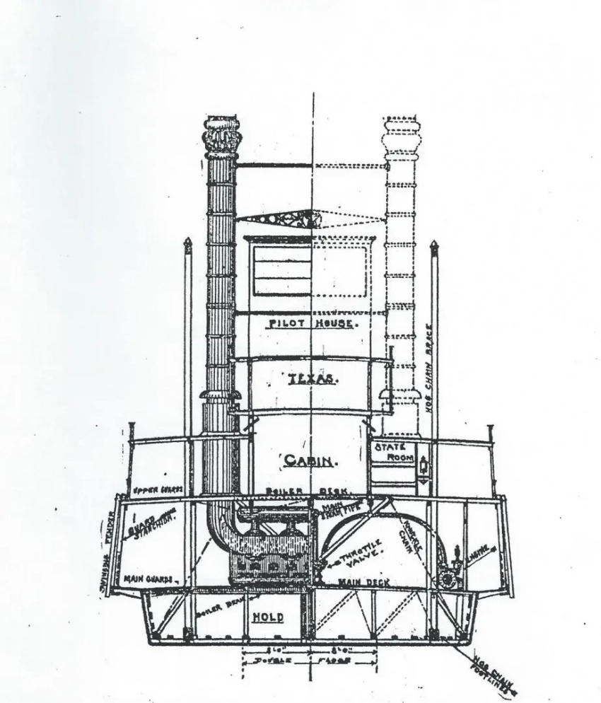 Пока же давайте рассмотрим устройство этих необычных судов. Хотя мы уже рассказывали о них, используя отрывки из книг Марка Твена и Майн Рида, есть смысл обратиться к… чертежам и посмотреть на них не только снаружи, но и изнутри.