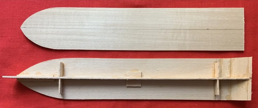 Корпус по парафиновой матрице выклеивается из папье-маше (размоченной в воде газетной бумаги), после чего укрепляется поперечными распорками и оклеивается «досками» — полосками шпона или же рейками толщиной 1,5–2 мм. Учтите, что погиби на нем нет, и ее нужно будет подрезать либо модельным ножом, либо сточить наждачной бумагой.