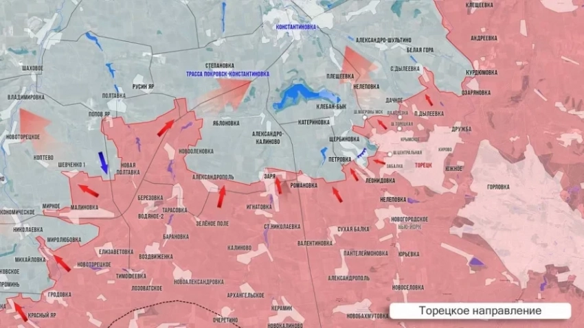 На Константиновском направлении Войска ГрВ «Юг» продолжают наступление, взламывая оборону противника южнее Константиновки по флангам у Клебан-Быкского водохранилища. Так, наши подразделения прорвались в центр Яблоновки с запада и юга (в районе кладбища), а также закрепились в южной части Александро-Калиново. Севернее Яблоновки - бои на высотах по овладению опорными пунктами ВСУ у трассы. Юго-восточнее наши подразделения продвинулись в районе балки Сухая в посадках севернее и восточнее в направлении Катериновки и Петровки (Новоспасского). Северо-восточнее наши войска выбили противника из шахты им. Матроны Московской. Для группировки противника в районе Щербиновка - Петровка ситуация складывается критически, возникает угроза попадания в оперативное или полное окружение. Из-за прорыва наших подразделений в южную часть Александро-Калиново возникает угроза обхода нашими подразделениями с запада основных оборонительных позиций ВСУ на подступах к Катериновке.