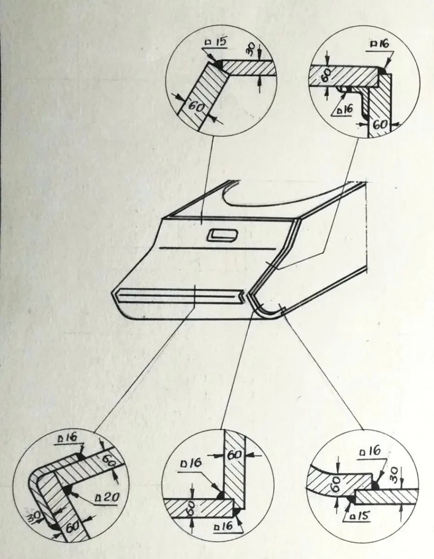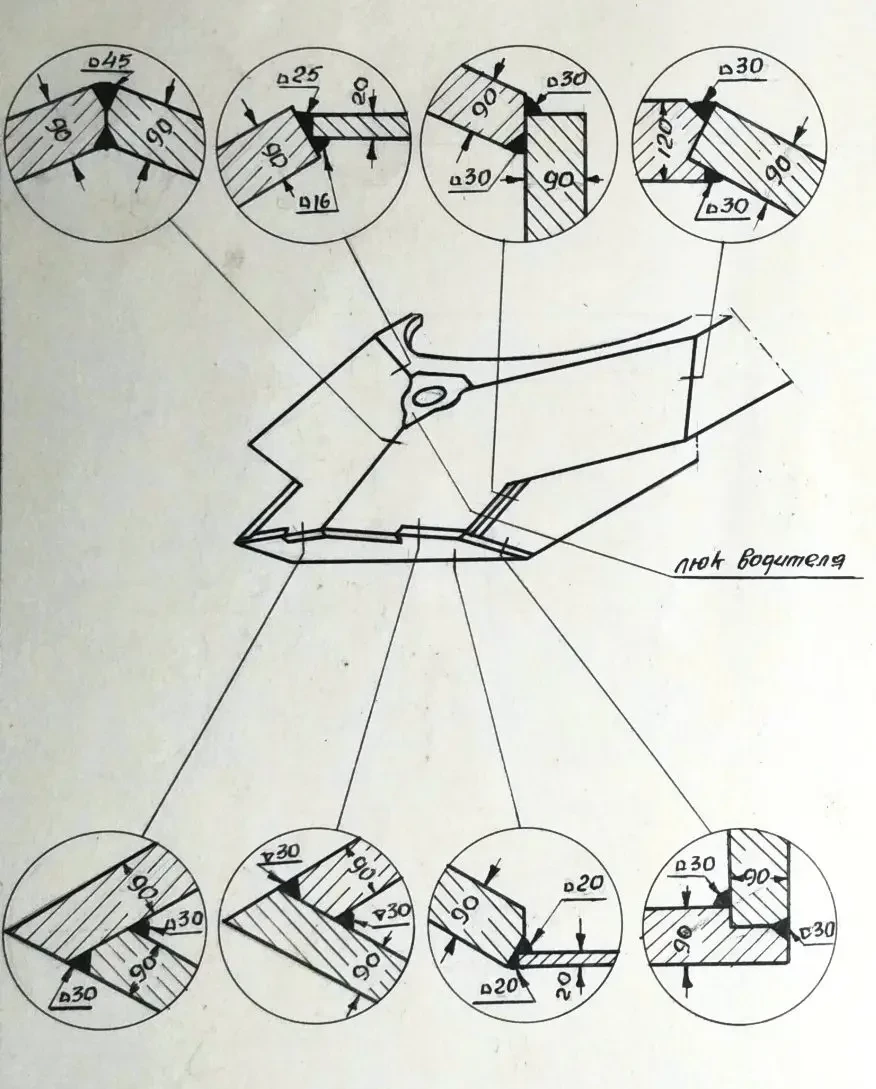 7. Для соединений нижних лобовых деталей с днищем корпуса хорошие результаты показывают такие же соединения, как и на крыше с лобовыми подкрылками, но выполненные с применением сварки только качественными электродами.