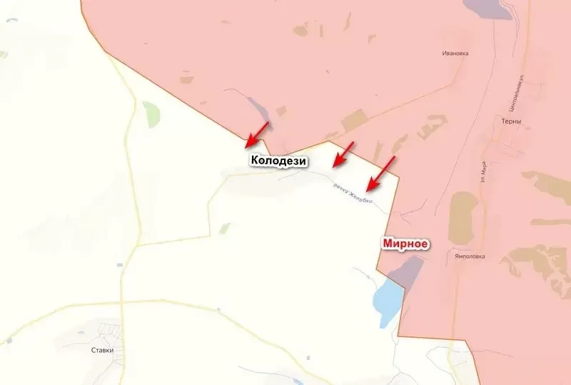 Штурмовые подразделения группировки войск «Запад» продолжают наступление в сторону Красного Лимана, взламывая оборону противника. В ходе последних боев нашим удалось практически выйти к реке Желобки между селами Колодези и Мирное, взяв под огневой контроль прибрежную зону на большом участке. Предполагается, что в ходе дальнейших боев противник будет вынужден покинуть свои позиции и отойти за реку. Северо-западнее Колодезей наши уже продвинулись.