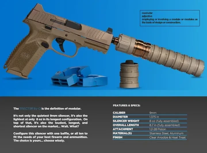 Модульный ПБС для пистолета Q-Erector. Внизу — отдельный модуль. Фото Thefirearmsblog.com