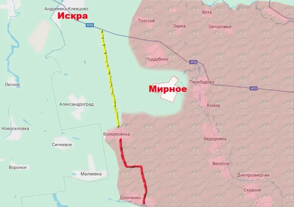 Пока за врагом остаётся участок этой дороги севернее Воскресенки – до поворота на Андреевку-Клевцово (Искру). Но как только будет освобождён населённый пункт Мирное (Карл Маркс), а всё к этому и идёт, то под контроль наших войск перейдёт и этот участок (жёлтый).