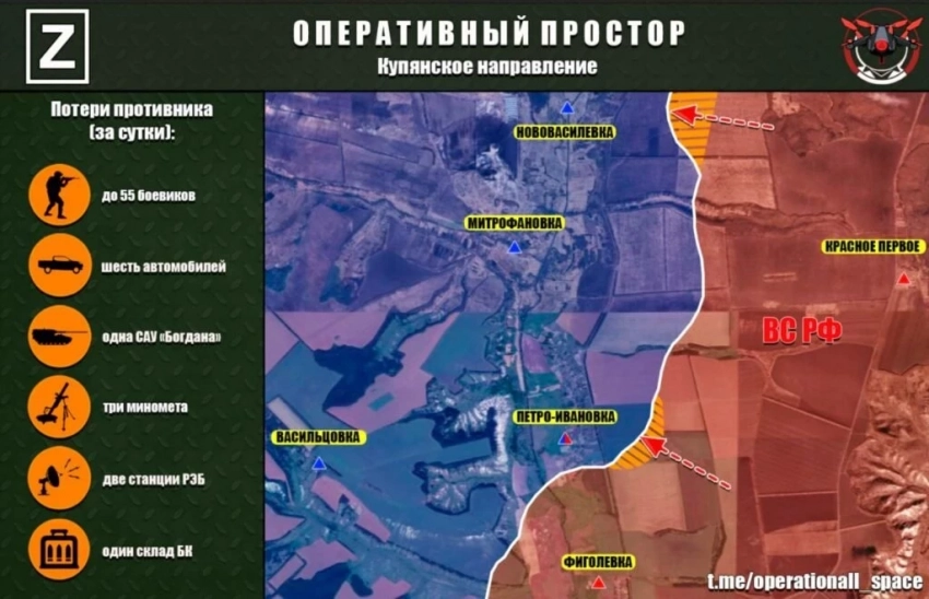 "Противник оказался фактически заперт на рубеже Зелёный Гай - Новохатское, с севера ограниченным естественной преградой - рекой Волчья. Все переправы через неё уничтожены, и ВСУ не в состоянии наладить снабжение", - отмечает Telegram-канал "Синяя Z борода".