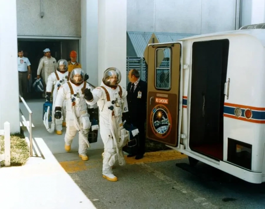 Члены экипажа «Аполлона» садятся в микроавтобус, чтобы ехать на стартовую площадку, 15 июля 1975 года. Впереди — командир экипажа Томас Стаффорд, за ним — Вэнс Бранд и Дональд Слейтон