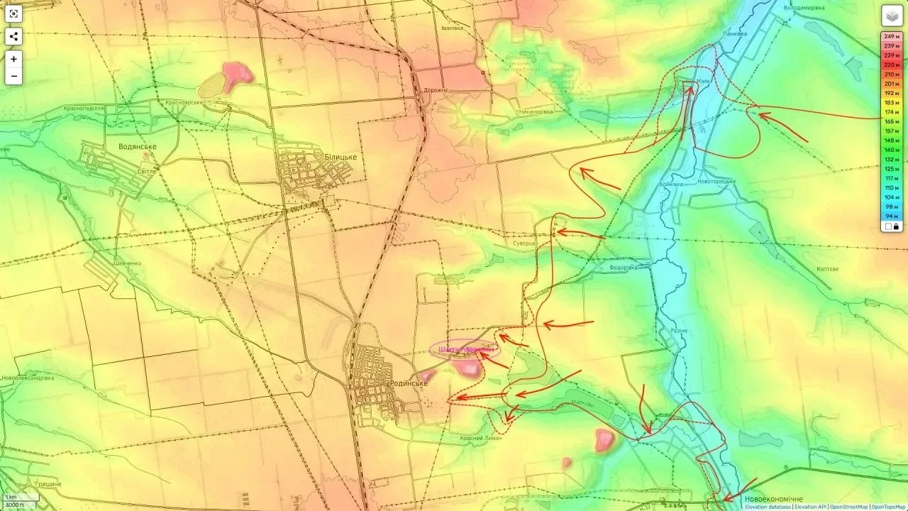 Несмотря на это, ВС РФ продолжают наступление. Российские части ведут бои за шахту «Родинская», одновременно продвигаясь к Родинскому и заняв восточные дома села Красный Лиман, которое плавно переходит в Родинское. Также бои идут в населённых пунктах Суворово (Затышок), Паньковка и с востока Владимировки.