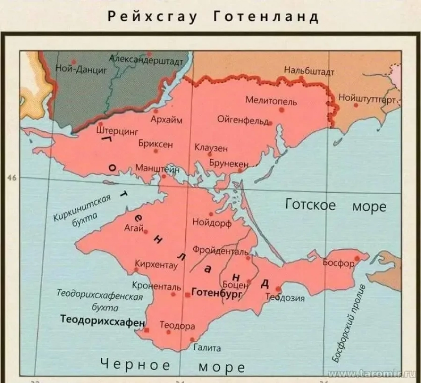 В новое марионеточное государство Готланд, конкретно в Севастополь – Теодорихсхафен, в Симферополь – Готенберг и в другие крымские города должны были переселиться обделённые немцы из Чехии и Южного Тироля в Северной Италии и Швейцарии. Свой соответствующий приказ по Крыму фюрер отдал ещё в апреле 1941 года, когда план «Барбаросса» только верстался.