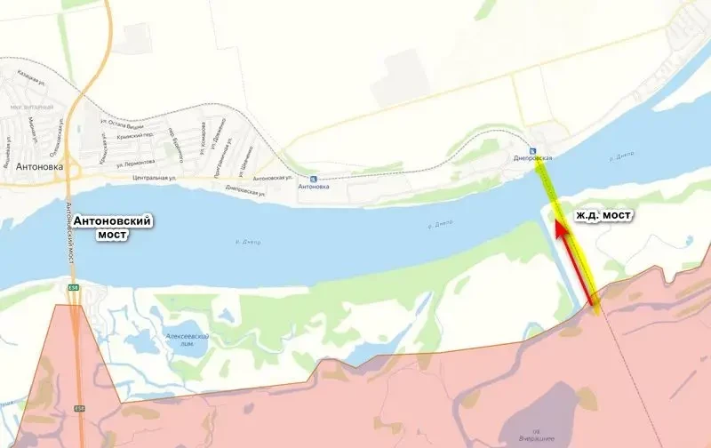 Сам мост был поврежден саперами ВС РФ при отступлении на левый берег Днепра в 2022 году. Поезда по нему пройти не смогут, а вот пешком перебраться на другой берег можно. Недаром так сильно за него цеплялись ВСУ.