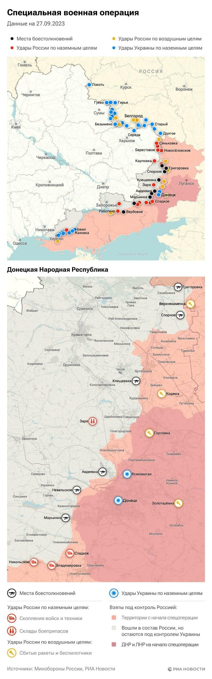 По состоянию на 13:00 сегодняшнего дня, 28.09.2023, остается актуальной та карта боевых действий на Украине, что была опубликована РИА Новости накануне. На ней отражены главные события.
