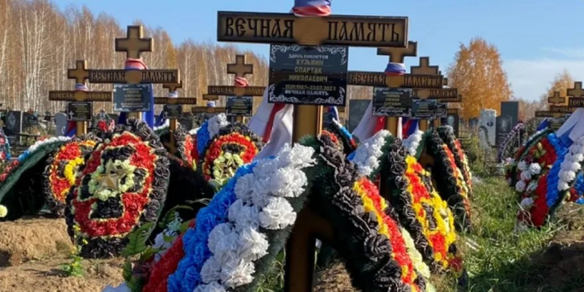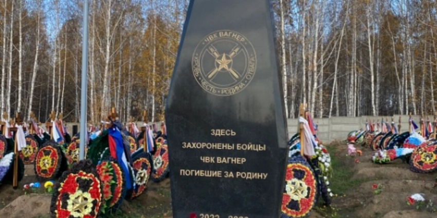 На Гусинобродском кладбище стоит «зуб Вагнера». «Здесь похоронены бойцы ЧВК Вагнер, погибшие за родину. 2022-2023».