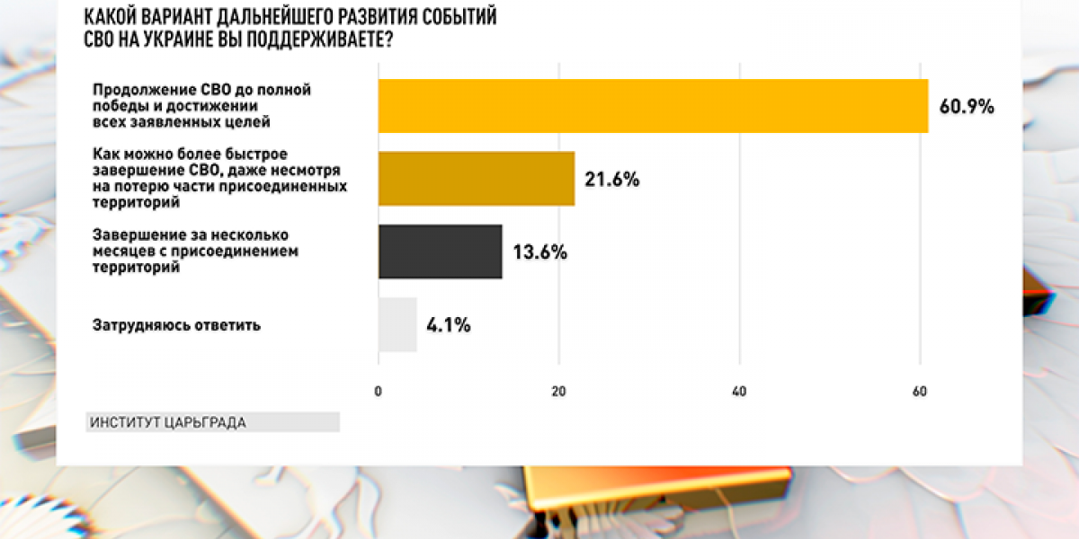 60,9% требуют от власти довести боевые действия до логического финала – пресловутого «достижения всех заявленных целей». Кто не понимает, какие цели поставлены перед нашей армией – смотрите исторические выступления Владимира Путина 21 февраля и 24 февраля 2022 года. Там всё сказано предельно ясно, подробно и сами по себе эти речи – программные. Как можно более быстрого завершения операции с отказом от утерянных территорий желает 21,6%. Иными словами, соотношение «партии победы» и «партии поражения» в обществе – 60% vs 20%