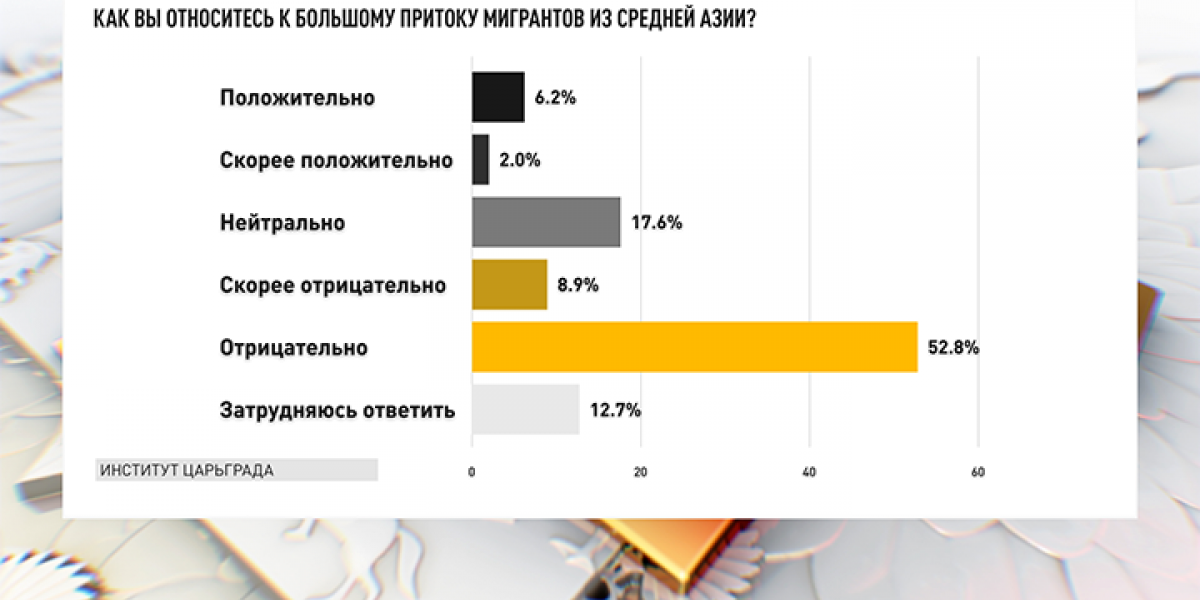 Полный консенсус в социуме наблюдается по важнейшей теме – миграционной. Положительное отношение к притоку мигрантов из Средней Азии высказывают только 8,2% граждан (интересно узнать, сколько из них – так называемые «новые россияне», получившие наши паспорта). Негативно к великому переселению среднеазиатских народов относится 61,7% респондентов.