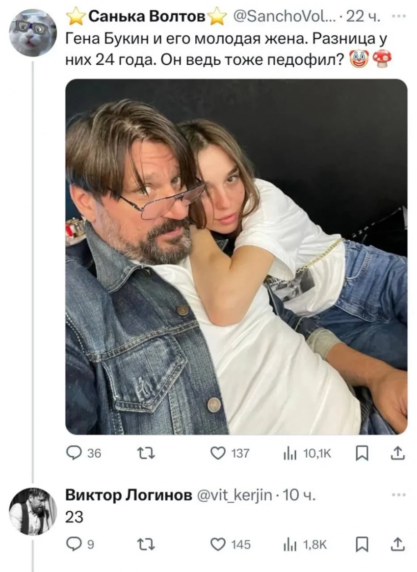 "Гена Букин и его молодая жена. Разница у них 24 года. Она похожа на подростка. Он ведь тоже педофил?" — спросил один из пользователей X (бывший Twitter, соцсеть заблокирована в РФ), опубликовав фото Логинова с его женой Марией Гуськовой.