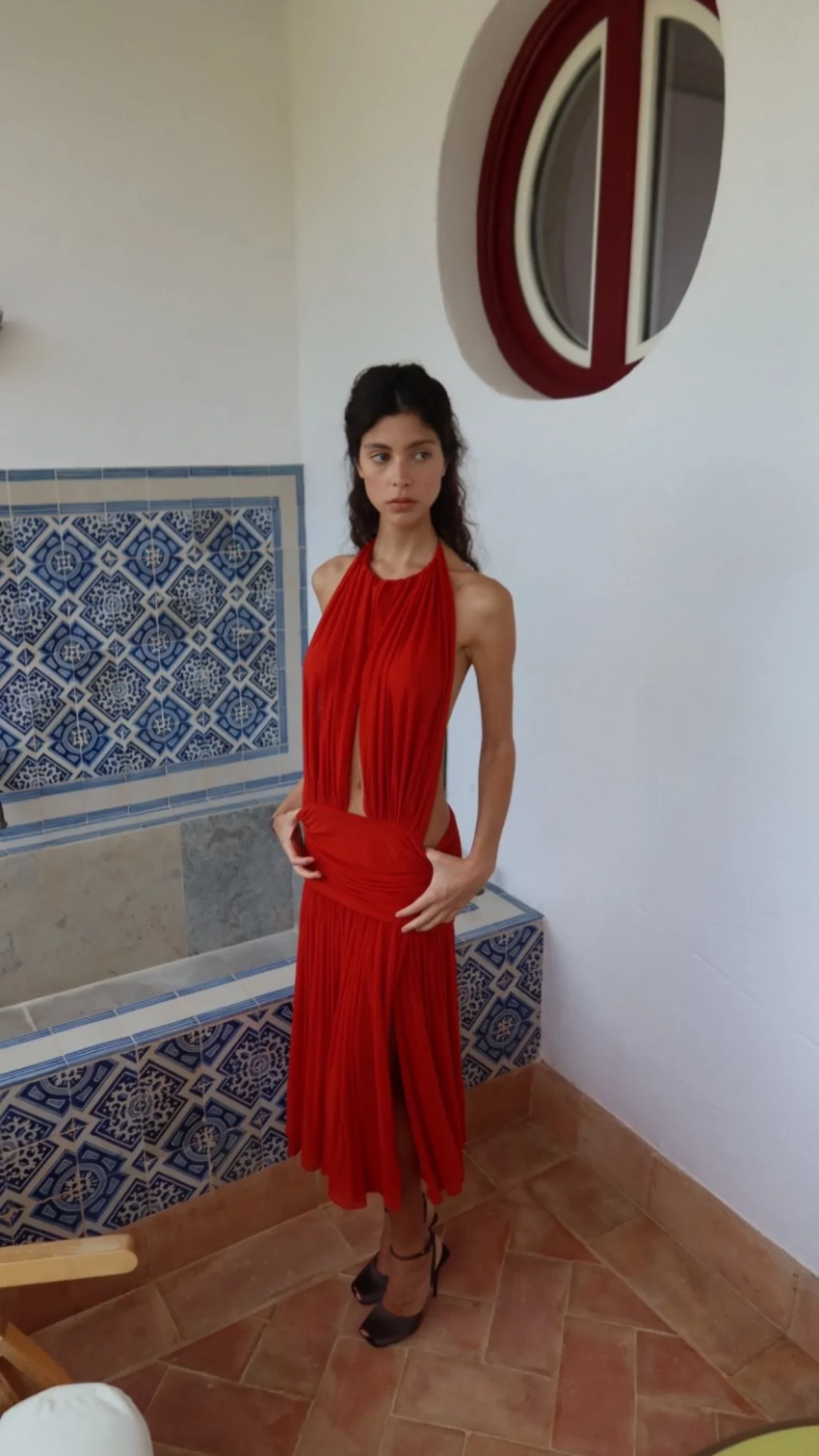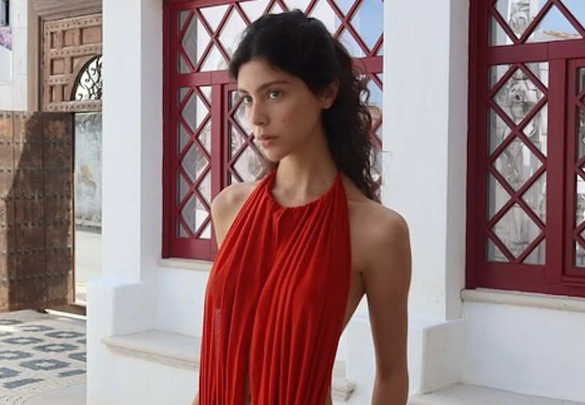 На снимках Варвара позирует в красном платье Mirror Palais с открытой спиной и прогуливается по пляжу в сером свитере с массивной чёрной сумкой Hermes.