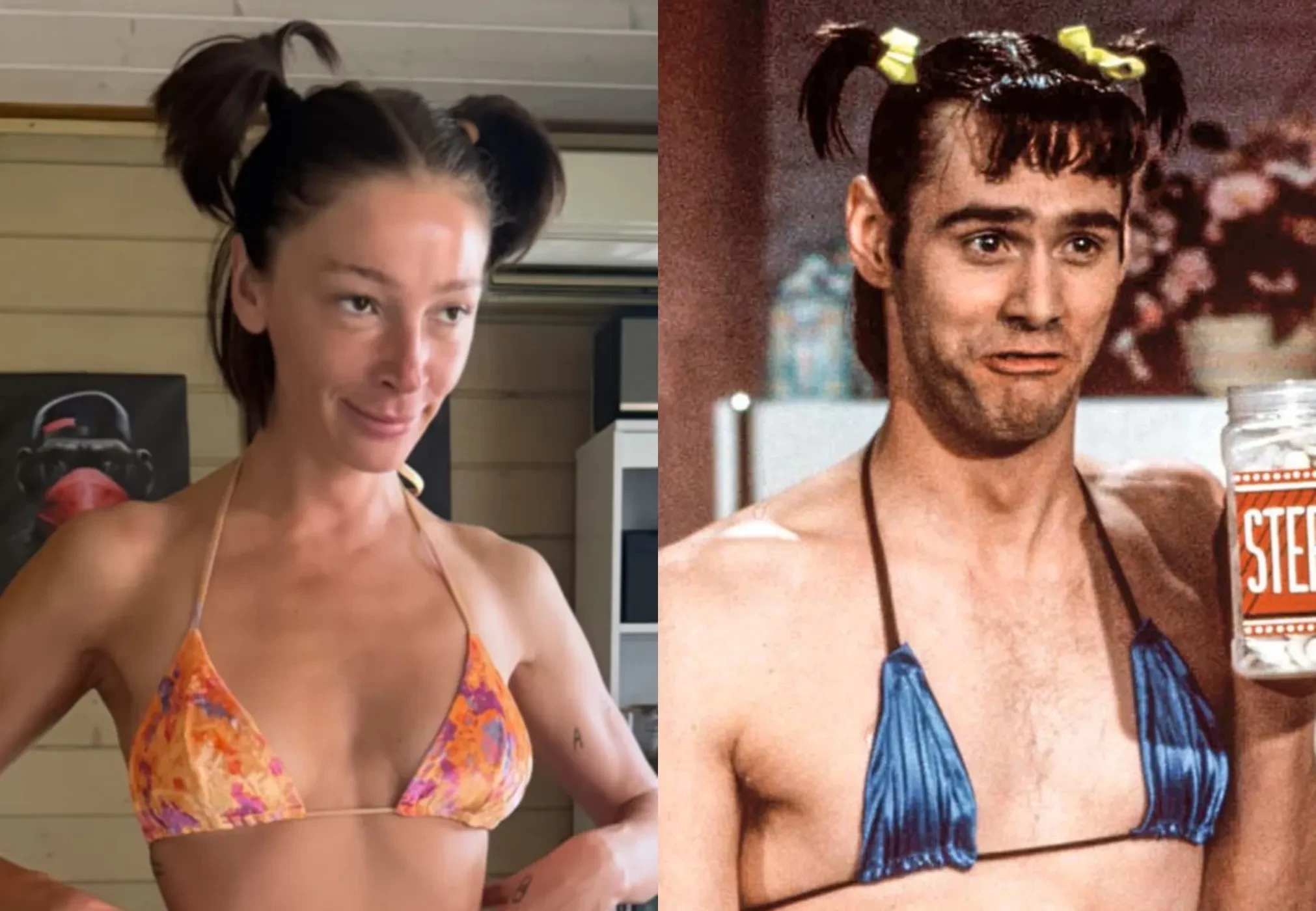 На фото Настя позирует в купальнике с цветочным принтом, поставив руки на талию. Волосы она собрала в два небрежных высоких хвоста и состроила забавную гримасу, пытаясь повторить фирменное выражение лица Джима Керри. К снимку Настя добавила кадры из скетч-шоу, где актёр когда-то появился в таком же амплуа.