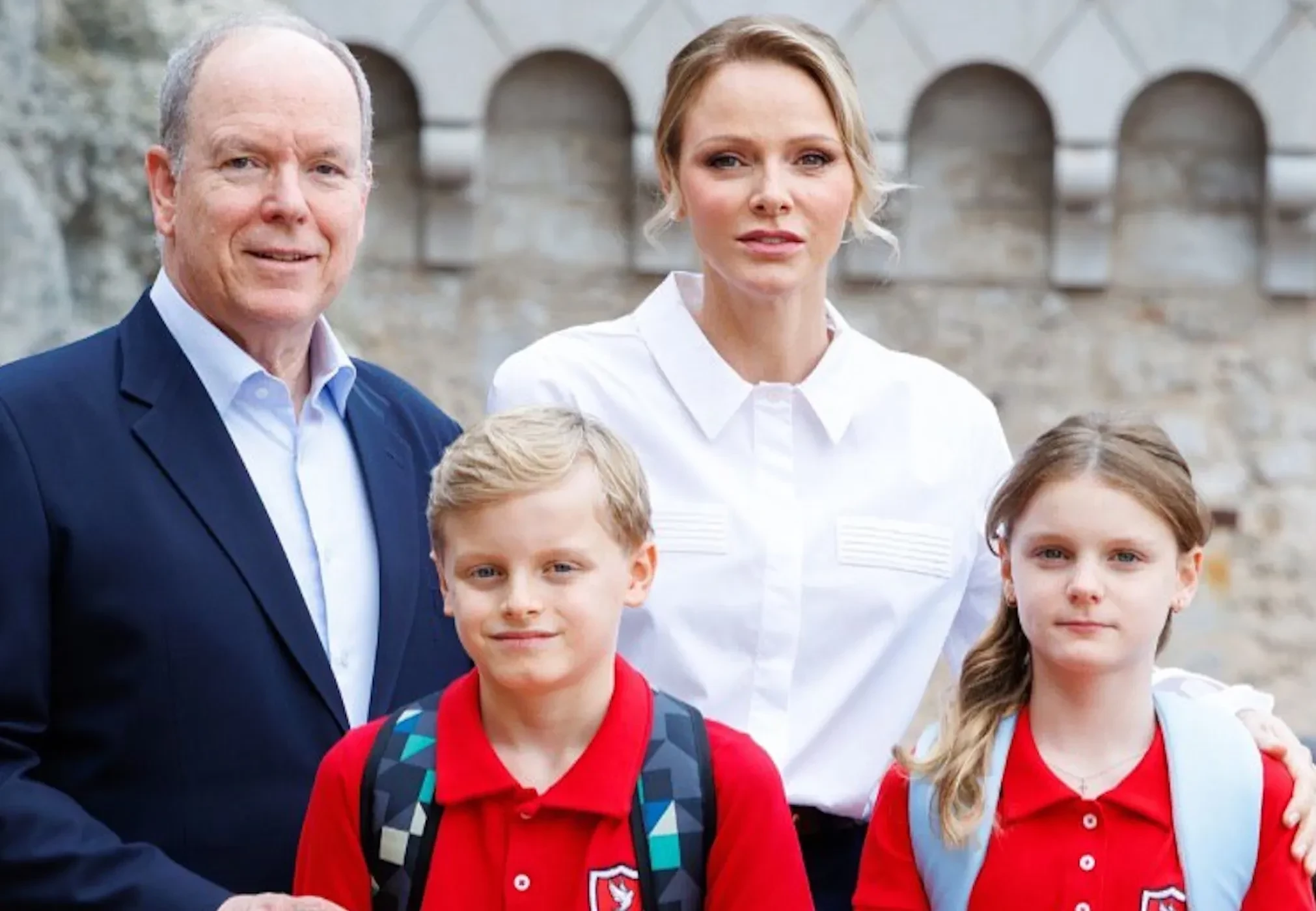 47-летняя княгиня провожала наследников в классическом образе: чёрных брюках и белой рубашке, а 67-летний князь Монако был одет в брюки и пиджак. Дети пары позировали рядом с родителями в школьной форме.