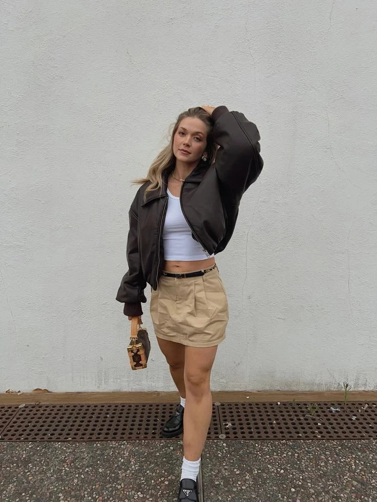 Юбки из экокожи в тандеме с атласным бомбером — игра фактур, которую можно дополнить каблуками для вечернего выхода. Твидовые мини с шерстяным бомбером и ботильонами — вариант для прохладных дней в стиле преппи.